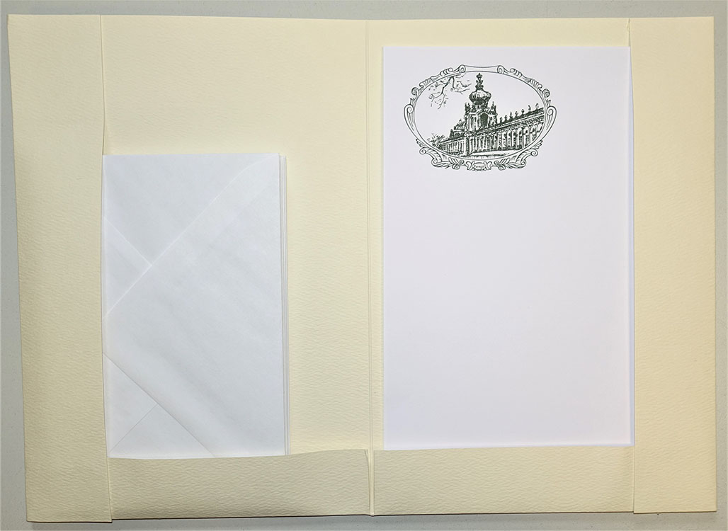 Inhalt: 10 Briefbögen und 10 Briefumschläge mit Seidenfutter